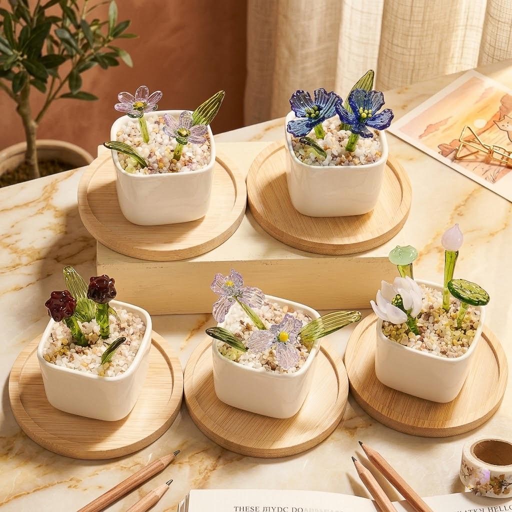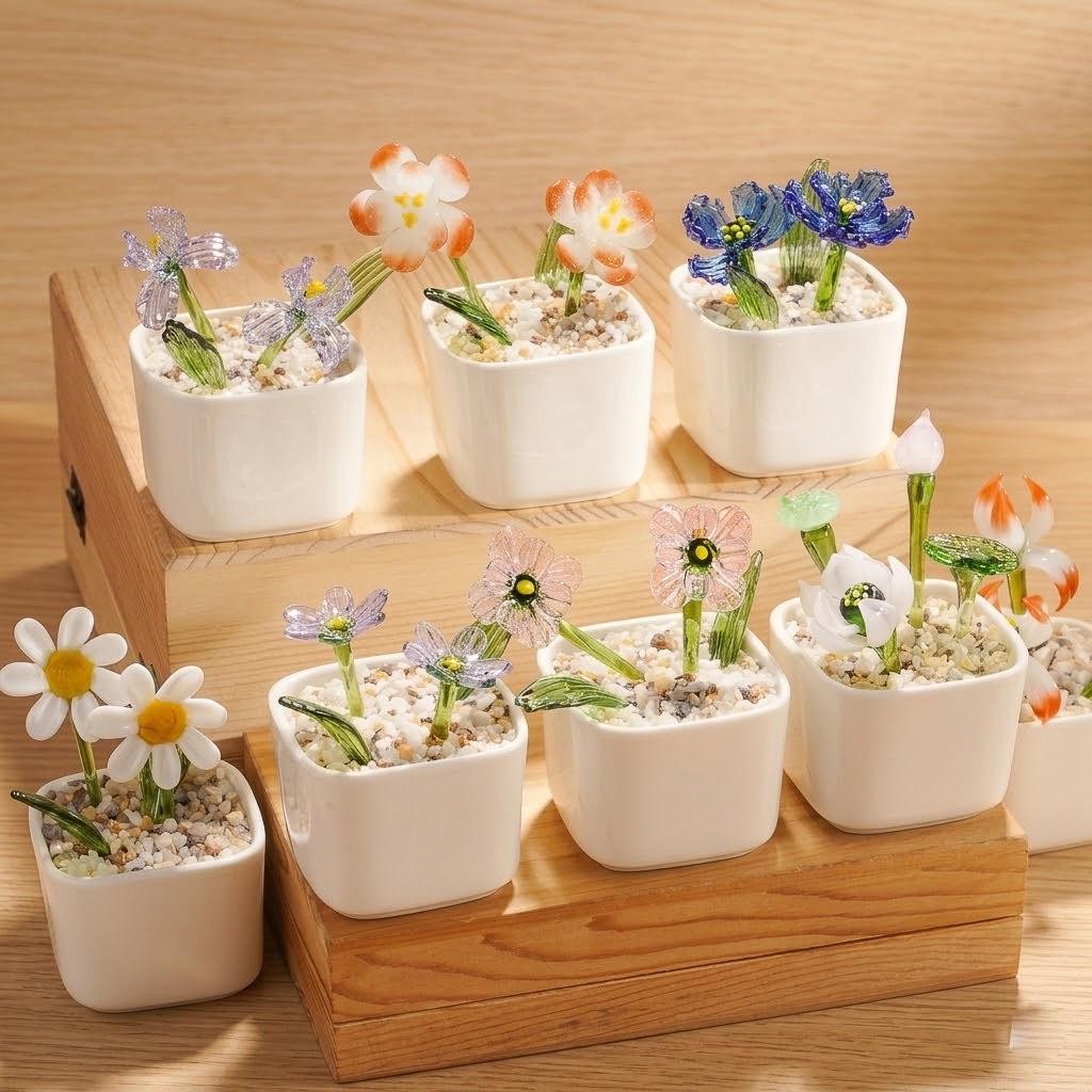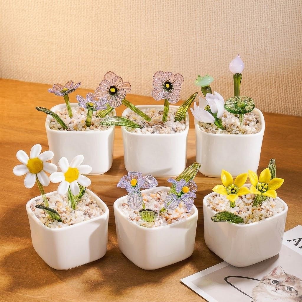 This personalized glass planter features a handmade everlasting flower in a ceramic pot,