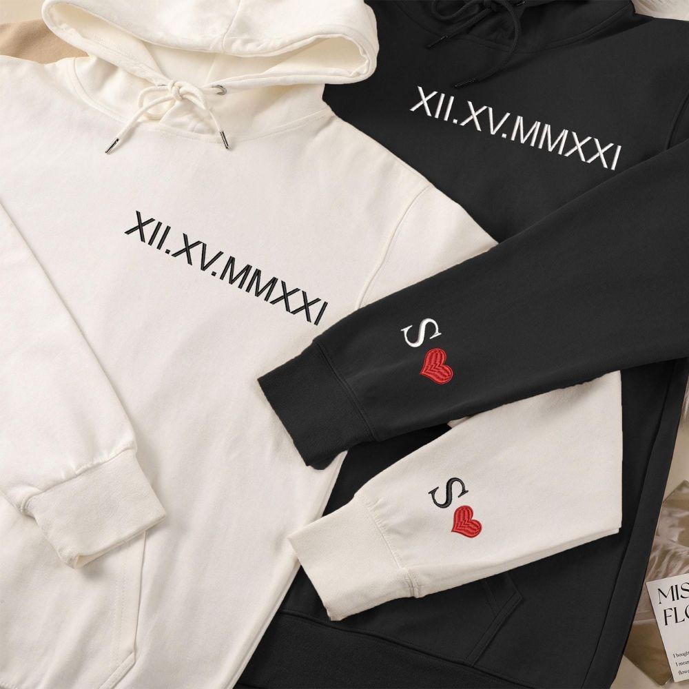 Embroidered Roman Numerals Sweatshirt | Anniversary Date Couple Hoodie | Old English Initials with Heart on Sleeve | Valentines Day Gift