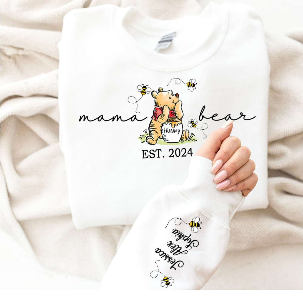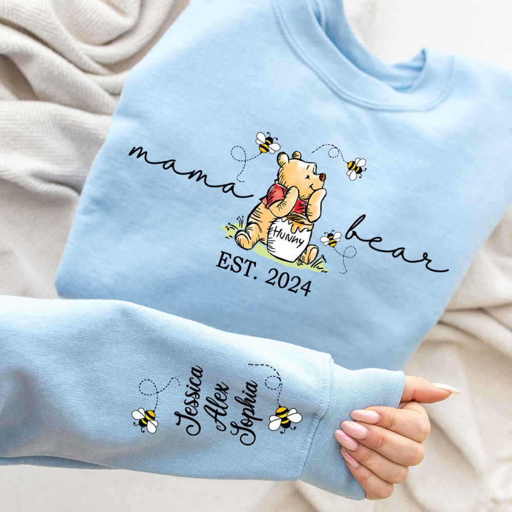 Custom Mama Bear The Pooh Sweatshirt, Mom Sweatshirt, Gift for Mothers Day Sweater,Custom Mama Sweatshirt With Kid Name On Sleeve