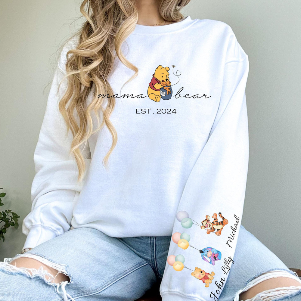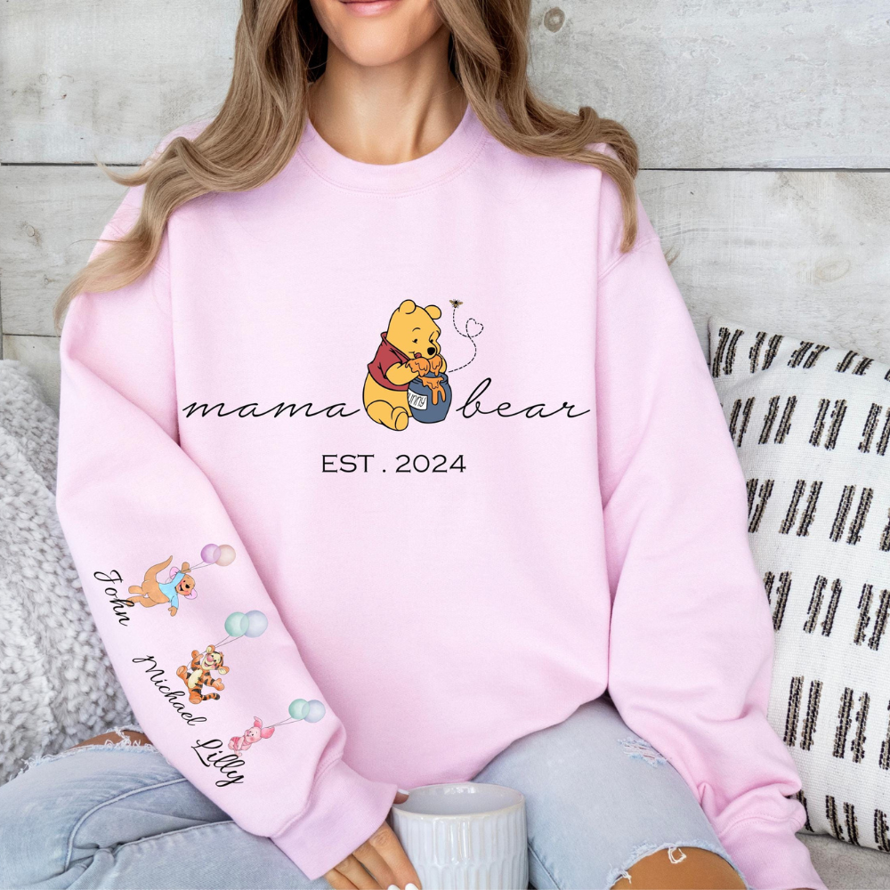 Custom Mama Bear The Pooh Sweatshirt, Mom Sweatshirt, Gift for Mothers Day Sweater,Custom Mama Sweatshirt With Kid Name On Sleeve