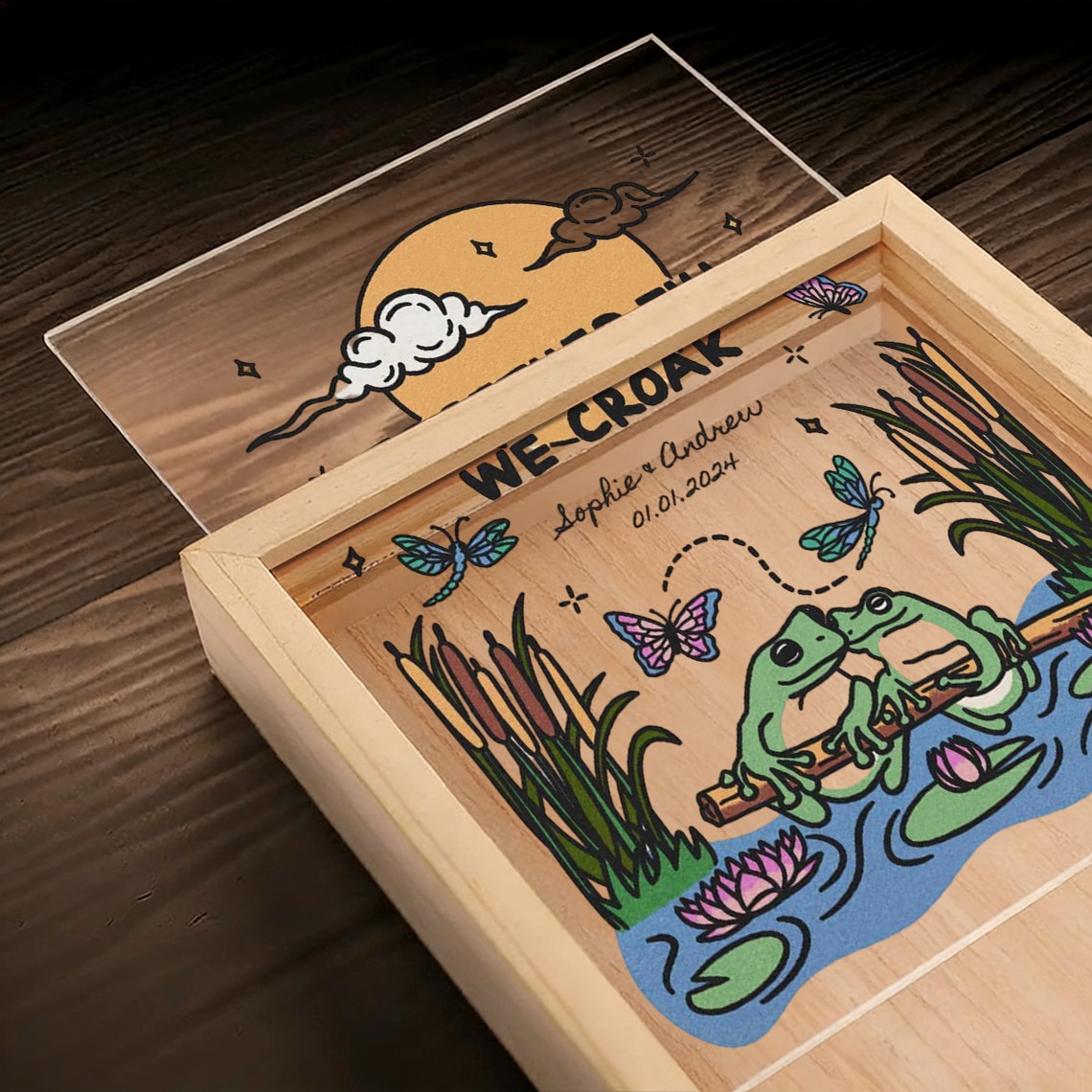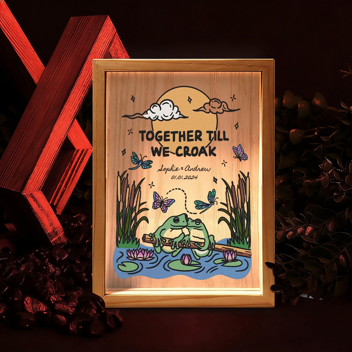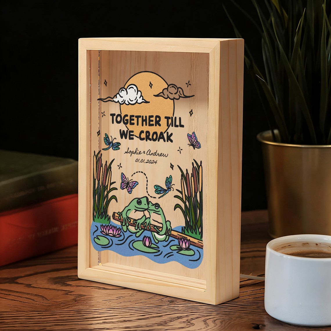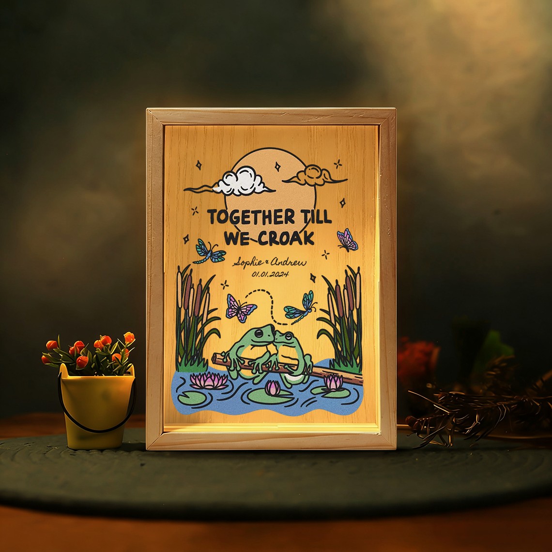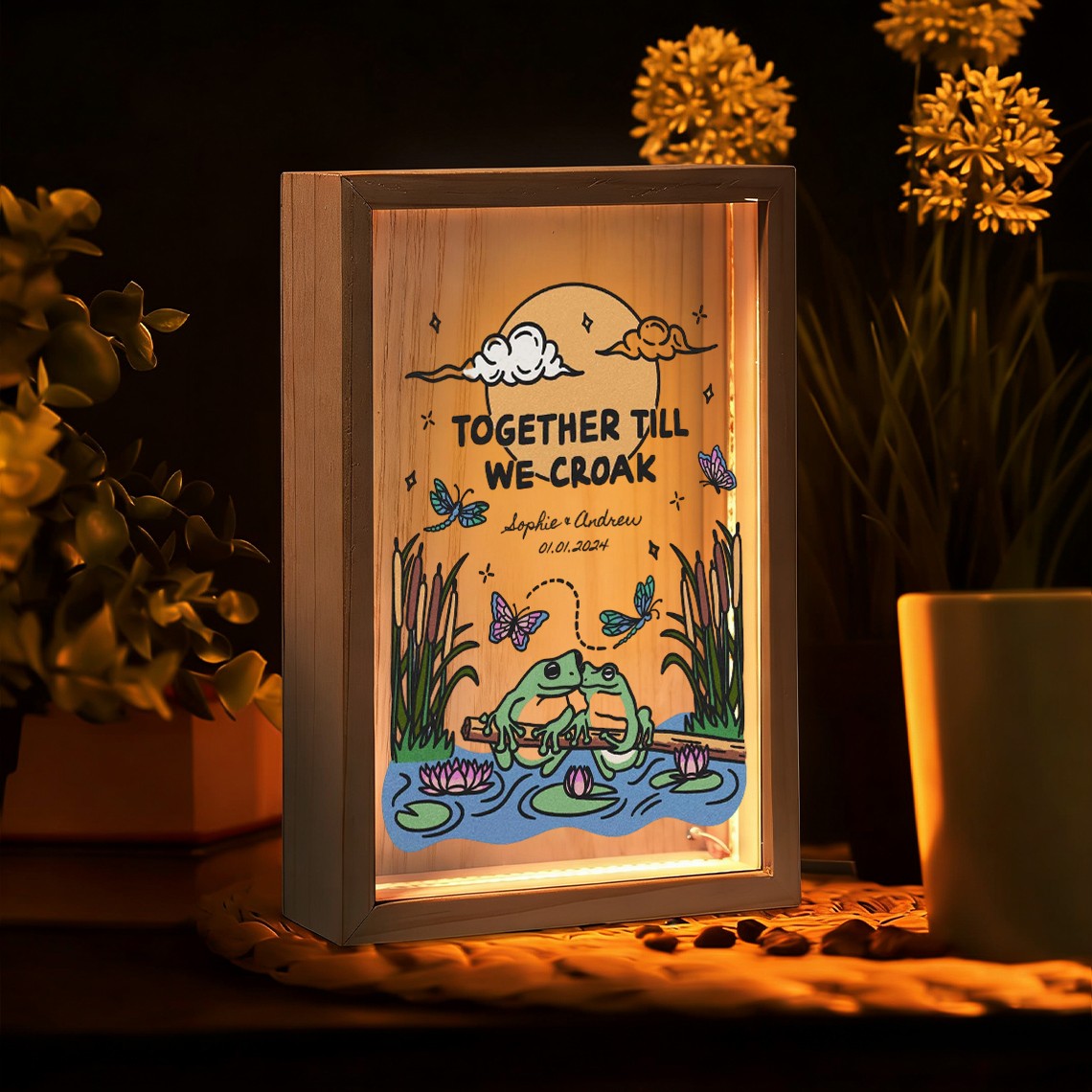The Custom Together Until We Croak Illustration Frame Light Box for Couple turns your personalized artwork into a warm and eye catching display. Made with a clear acrylic panel and a natural wood base, it adds a modern touch to bedrooms, desks, and living spaces. The print appears on one side with a soft mirrored reflection on the back, creating a clean and layered visual effect.
