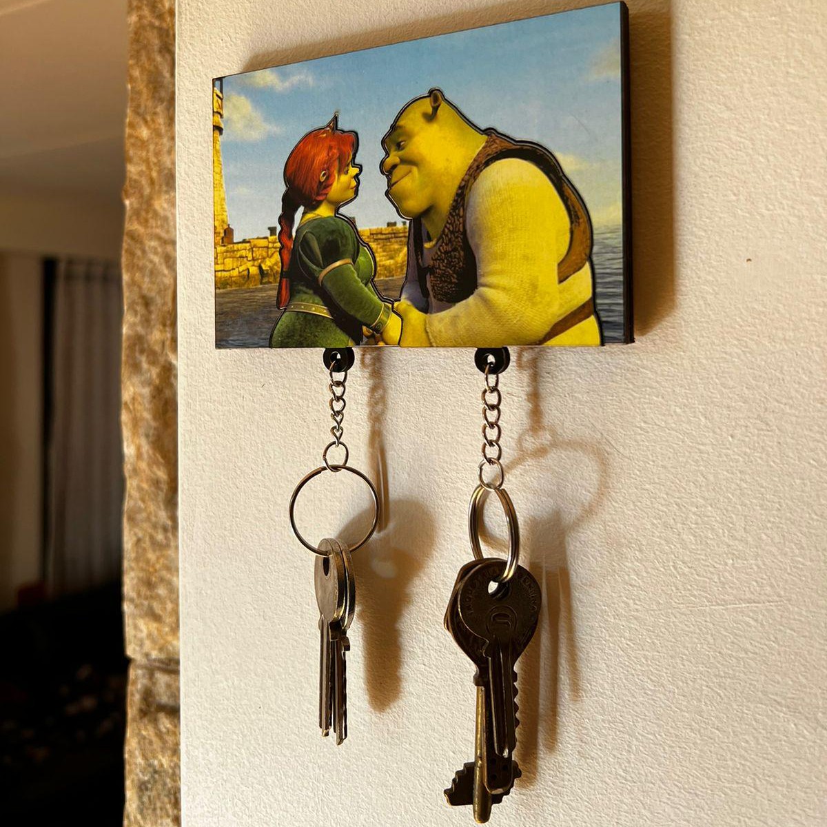 This keychain holder showcases a lovable cartoon couple illustration that represents togetherness and affection. With soft colors and playful details, it instantly brightens your entryway, bedroom, or office.